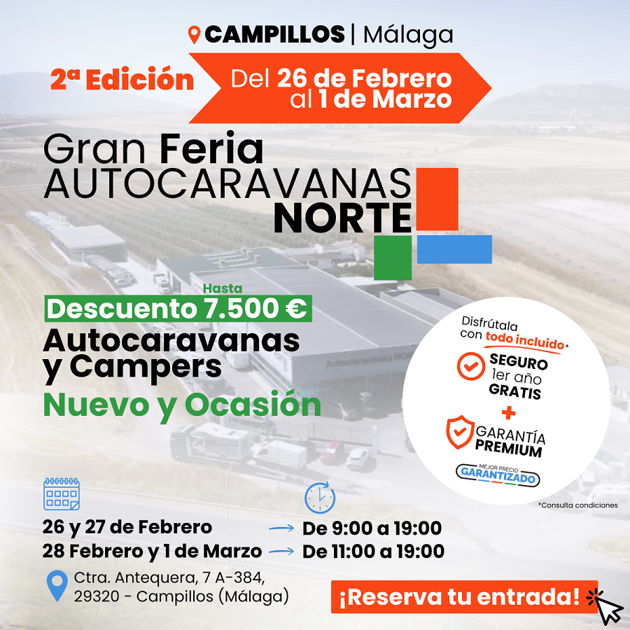 La feria se desarrollará en la sede malagueña de Autocaravanas Norte (carretera de Antequera, 7-A-384, 29320-Campillos, Málaga) desde el próximo jueves (26 de febrero) y hasta el domingo (1 de marzo). Los interesados en asistir pueden inscribirse y solicitar toda la información sobre el evento a través de la página web. El horario será de 9.00 a 19.00 horas, el jueves ye l viernes, y de 11.00 a 19.00 horas, el sábado y el domingo.